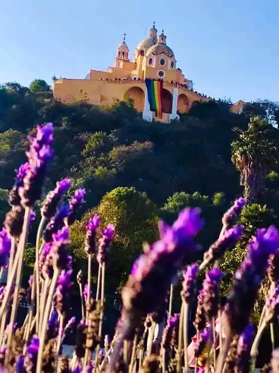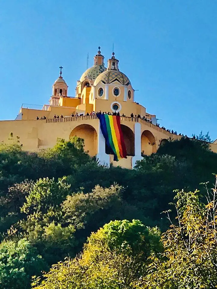 La tarde de este 30 de noviembre, activistas del bloque Lésbico Gay Bisexual Transgénero Transexual Travesti Intersexual (LGBTI+) colocaron una bandera arcoíris monumental en la Iglesia de Los Remedios de Cholula.