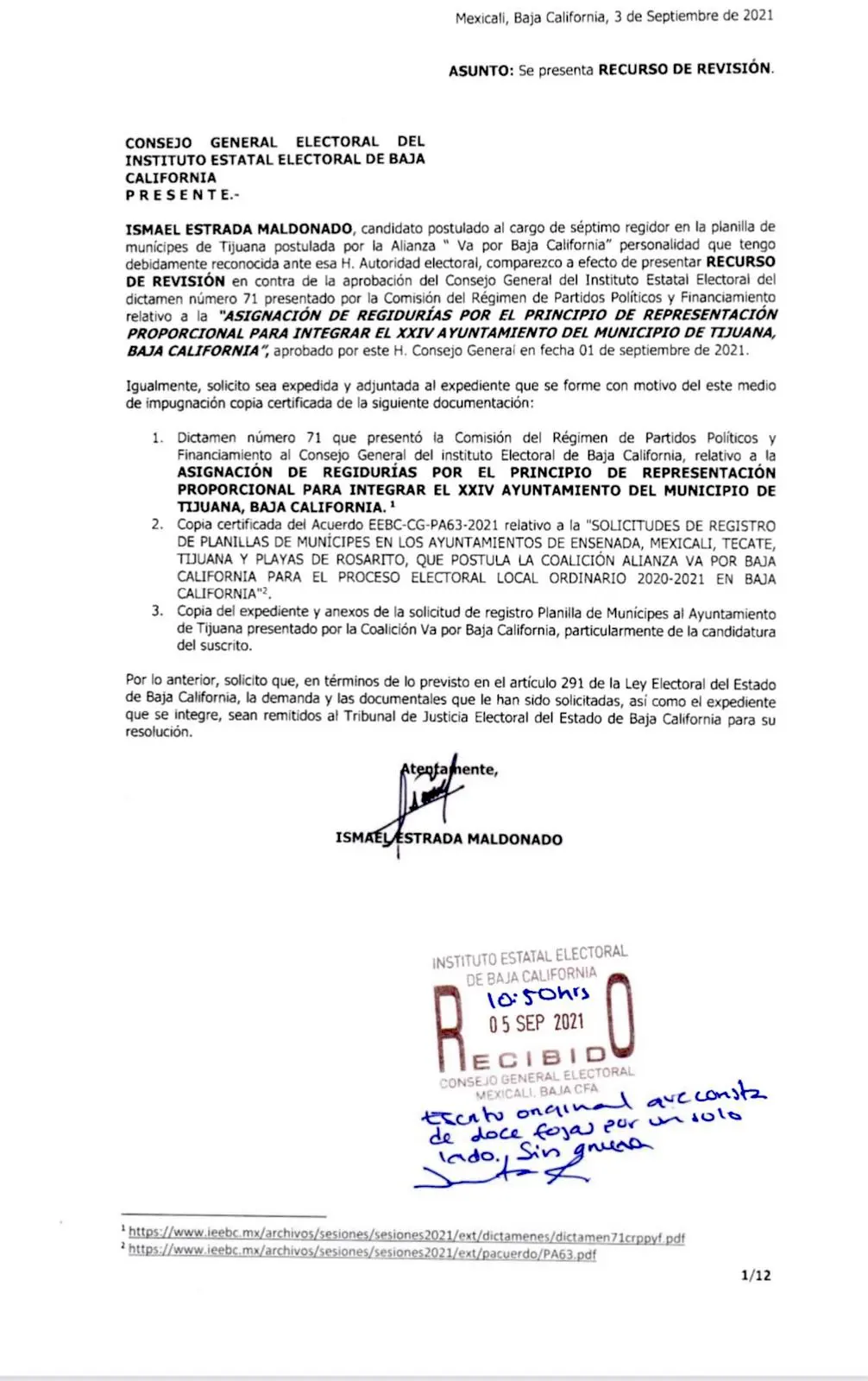 Ante el Tribunal Electoral de Baja California, Ismael Estrada Maldonado, postulado en la planilla de munícipes de Tijuana por la Alianza Va Por Baja California por la acción afirmativa LGBTTTIQ+, presentó un recurso de revisión, al considerar que se violaron sus derechos.