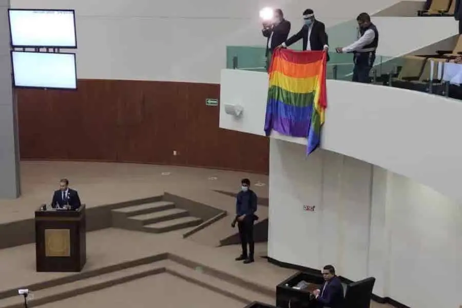 La bandera de la comunidad LGBT se mostró en el Congreso de Tamaulipas para exigir a los diputados de la 65 Legislatura modificar las leyes de la entidad para que se puedan realizar los matrimonios entre personas del mismo sexo sin necesidad de un amparo.