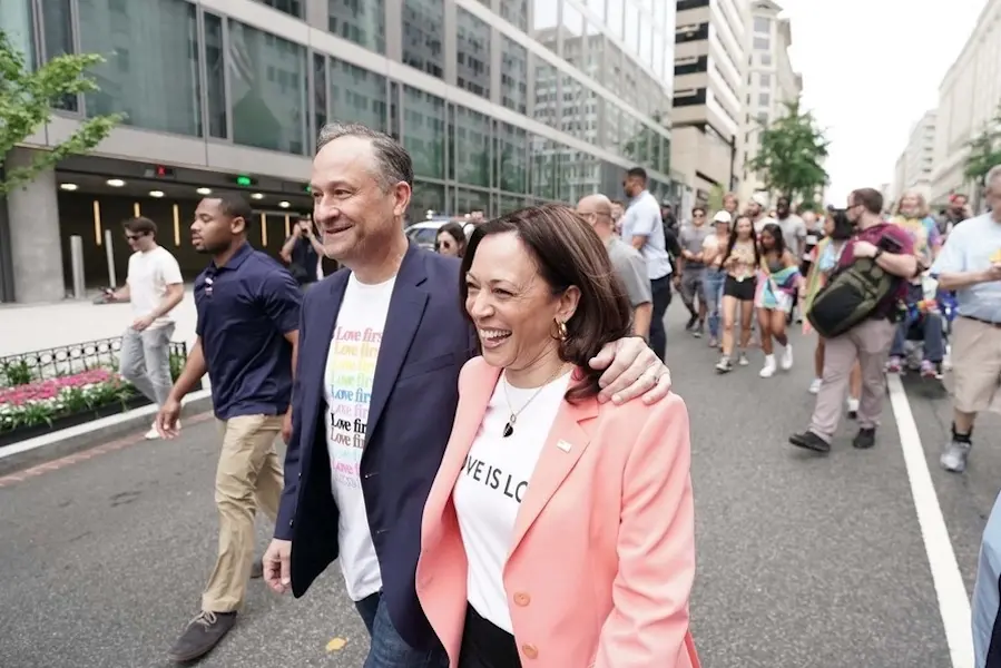 Vestida con un saco rosa y una camiseta con el lema «Love is love» («El amor es amor»), Harris se sumó a la marcha del orgullo organizada por una organización local de Washington junto a su esposo, Doug Emhoff.