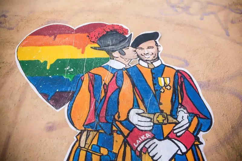 La artista urbana Laika ha pegado un poster cerca de la plaza de San Pedro del Vaticano en el que retrata a dos soldados de la Guardia Suiza, la del papa, besándose con un corazón con los colores del arcoíris de fondo: “Ama al prójimo”, ha escrito en sus redes.