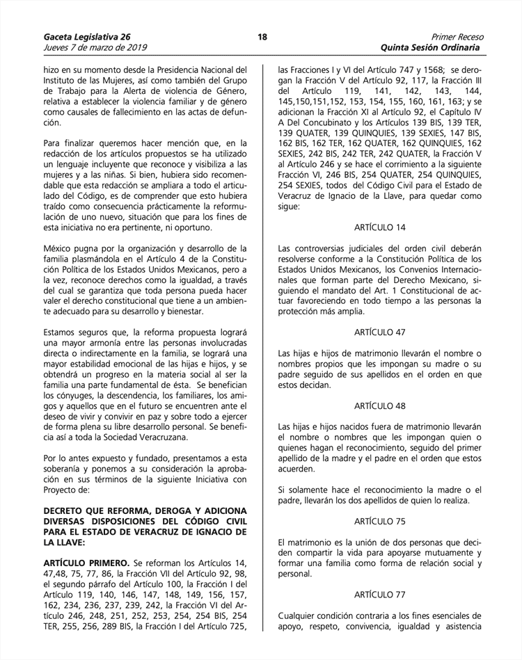 La propuesta es casi idéntica a la que se enlistó en la sesión del 7 de marzo del 2019; contiene la misma exposición de motivos; el único cambio en su redacción es la definición de matrimonio que se incluye en el artículo 75.