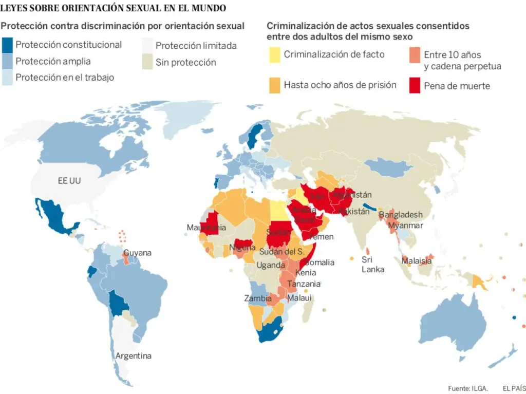 Hay un mapa del mundo que se divide básicamente en dos colores. Uno impregna 70 países, donde ser gay o lesbiana es ilegal, incluso letal. Otro tiñe las 123 naciones donde mantener relaciones sexuales con personas del mismo sexo no está castigado. La mayor asociación de defensa del colectivo LGTBI del mundo dibuja este croquis periódicamente que muestra cómo decrecen los lugares donde se persigue a las personas por su orientación sexual y emergen nuevas amenazas, como la llegada al poder de líderes homófobos.