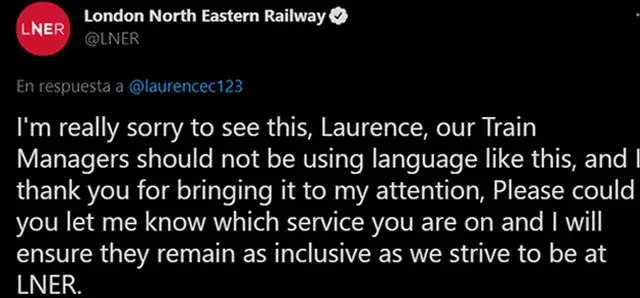 “Lamentamos mucho ver esto, Laurence, nuestros gerentes de trenes no deberían usar un lenguaje como este, y agradezco que nos hayas llamado la atención. Por favor, ¿podría informarme en qué servicio se encuentra y me aseguraré de que sigan siendo tan inclusivos como nos esforzamos por ser en LNER?”.
