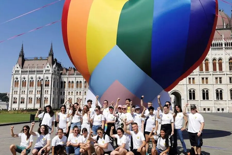 Amnistía Internacional de Hungría (AI) y la asociación Háttér por los derechos de la comunidad LGBT+ simbolizaron hoy esa rebeldía inflando un globo de diez metros de alto, en forma de corazón y los colores del arcoíris, frente al Parlamento húngaro.