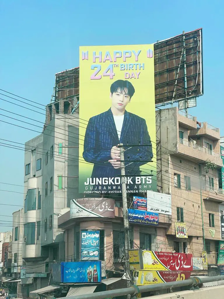 El anuncio, ubicado en un piso elevado alrededor de cuatro pisos sobre una intersección en la ciudad, únicamente mostraba una fotografía de Jeon Jungkook en un traje blanco y negro, así como dos leyendas: “Feliz cumpleaños número 24” y “Jungkook BTS Gujranwala Army”. Sin embargo, el propietario del boletín fue obligado a retirarlo luego de recibir una denuncia por parte de un miento local de la asamblea legislativa.