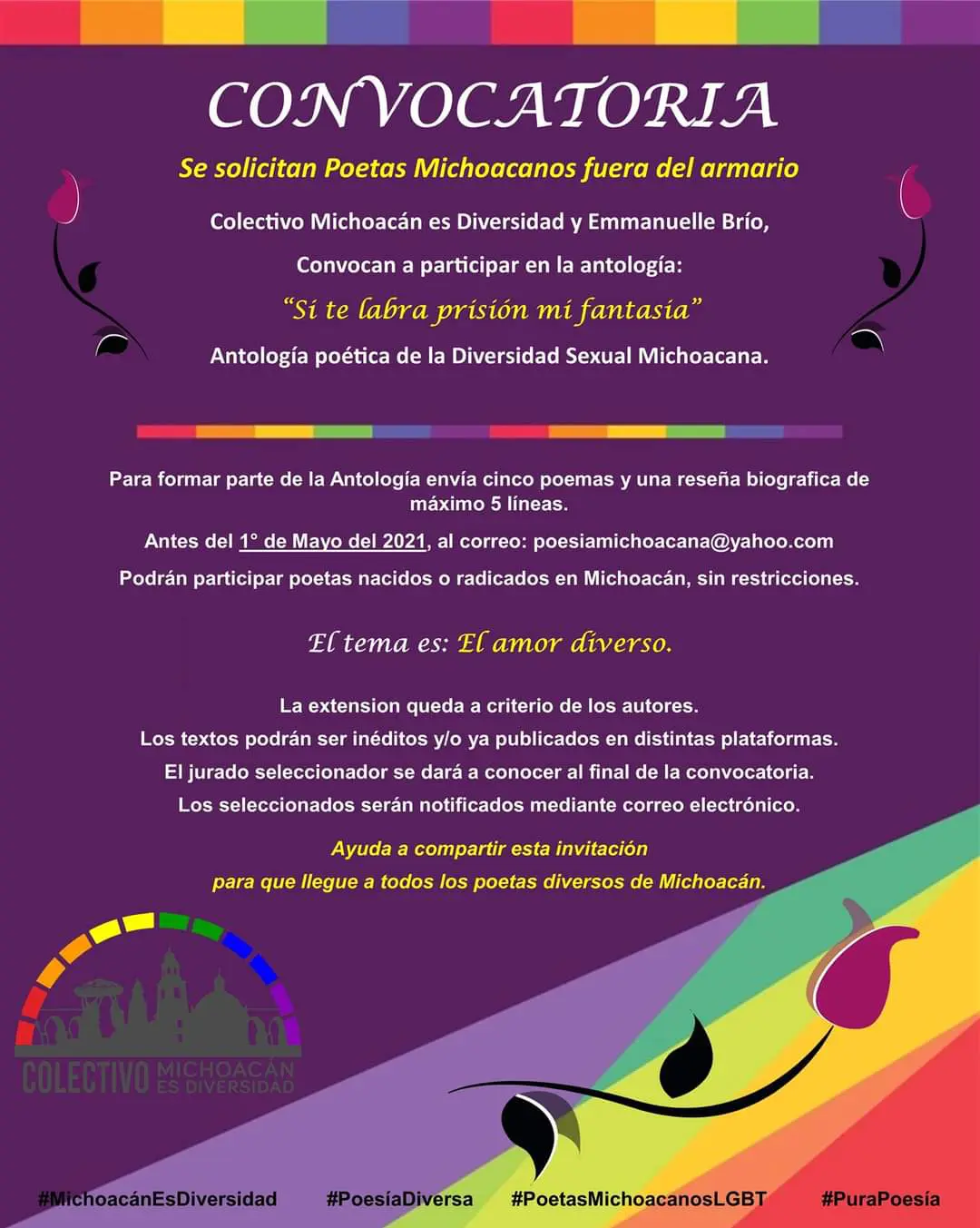 Para participar en la “Antología poética de las Diversidad sexual michoacana”, es necesario enviar cinco poemas –cuya temática es “el amor diverso”– y una reseña biográfica al correo: poesiamichoacana@yahoo.com , antes del 01 de mayo del presente año. Pueden participar poetas nacidos o radicados en la entidad con obras inéditas o ya publicadas en distintas plataformas.