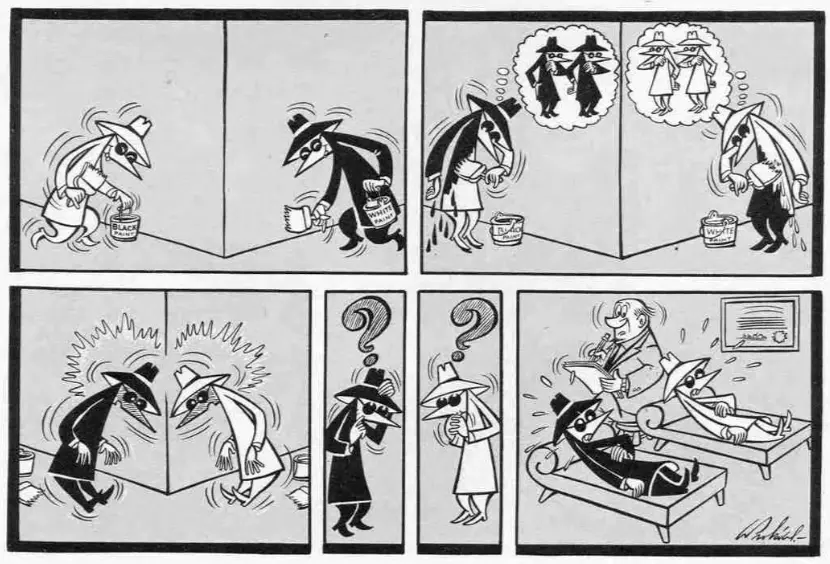 Esta flexibilidad se extiende más allá de la configuración superficial: es la idea en el centro de la metáfora y, por tanto, en el centro de la extravagante mecánica de la tira. La estructura típica de un Spy vs SpyLa tira involucra al Espía A notando el plan de ataque del Espía B, el Espía A desarrollando un contraataque, solo para que el Espía B haya planeado este nuevo plan, revelando el plan original como una artimaña diseñada para frustrar la respuesta predecible del Espía A. No sólo son similares, parecidos y en constante conflicto, sino literalmente idénticas, retorcidas inversiones entre sí que siguen siendo una y la misma. En mi tira original favorita de Prohías, ambos espías deciden pintarse del mismo color que su enemigo para infiltrarse en la operación del otro. Cuando se encuentran en una esquina, solo se enfrentan a su propio impío doppelgänger. El último panel muestra a los espías uno al lado del otro en terapia, aterrorizados e inseguros de quiénes son realmente.