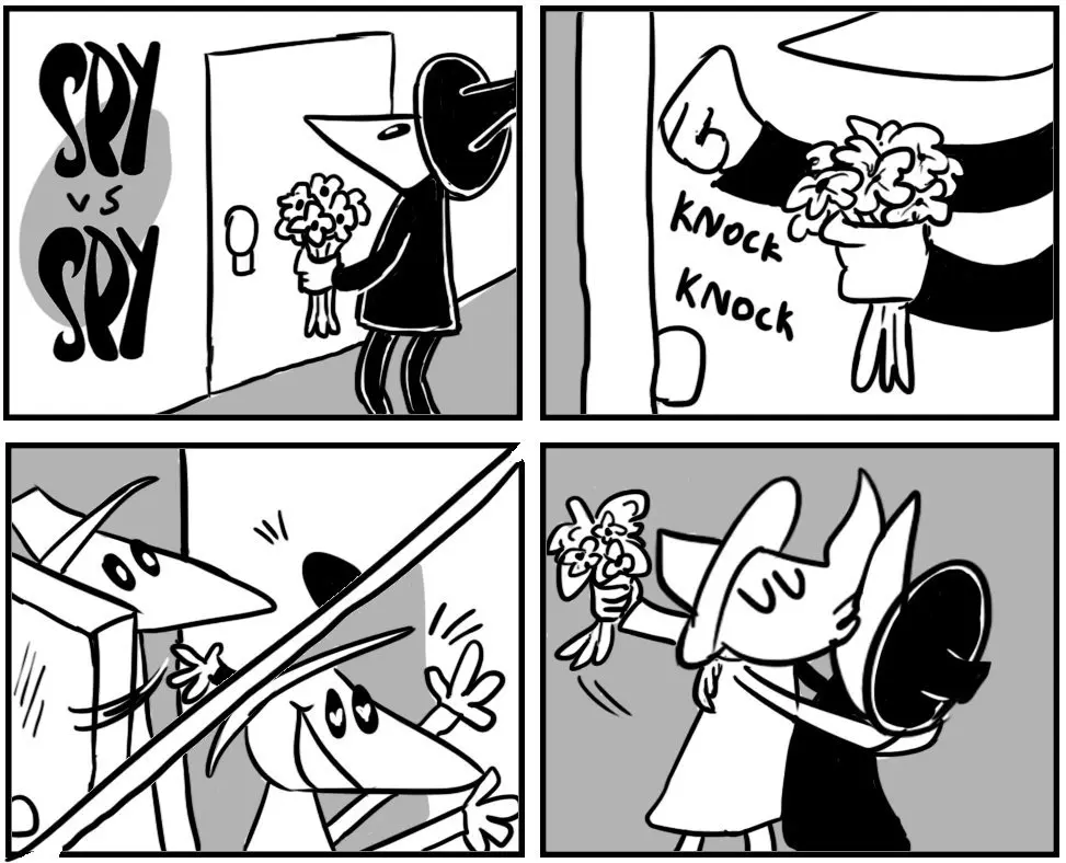 Los espías de Spy vs. Spy son patriotas sin países, condenados para siempre a representar los gestos violentos de la guerra sin ningún contexto que distraiga (o justifique) la carnicería. En una historia de Instagram de 2020 , el escritor Ocean Vuong destacó otros dos componentes clave de una buena metáfora: a saber, que el tenor y el vehículo de una comparación metafórica deben tener tanto una conexión sensorial como una conexión lógica/emocional. De esta manera, Espía contra Espía nos muestra que la guerra es su propio reflejo perfecto, las bombas, las armas y los misiles como el punto final táctil y lógico de la autoimagen de un país, y la muerte como la única forma de definir una nación. No es casualidad que toda la información SUPER SECRETA que los espías intentan robarse unos a otros sean planos para más armas.