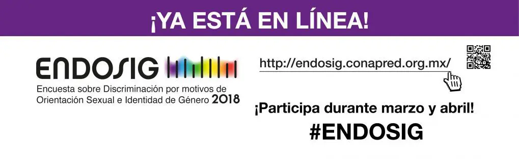 El Consejo Nacional para Prevenir la Discriminación (Conapred) y la Comisión Nacional de los Derechos Humanos hacen un llamado a los miembros del colectivo LGBT+ del país a participar en la Encuesta sobre Discriminación por motivos de Orientación Sexual e Identidad de Género #ENDOSIG 2018, misma que se encuentra ya en línea en http://endosig.conapred.org.mx y www.cndh.org.mx/ENDOSIG